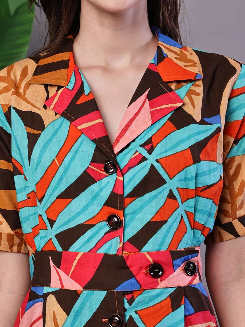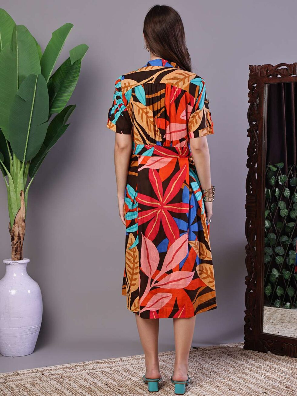 Women’s Leaf Print Button-Down Cotton Midi Dress